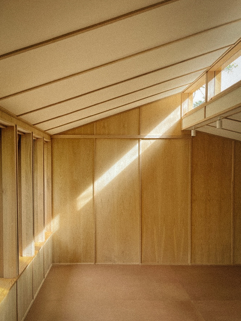 The design maximises natural light, with a clerestory window bringing southern daylight into the space and large front-facing windows offering views of the garden. A light well surrounding the tree contributes to an even light throughout the studio.